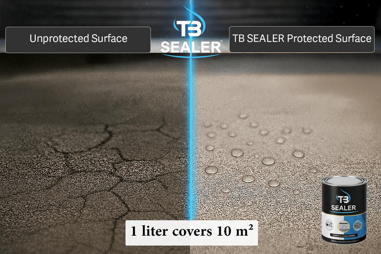 TB SEALER is a next-generation, bio-based, transparent, single-component coating technology developed to provide high-performance waterproofing and long-lasting durability on concrete, stone, wood and metal surfaces. Its advanced formula penetrates deep into the substrate without altering the natural texture, forming an effective and invisible protective barrier against water, moisture, vapor, chemical exposure, dust and environmental pollution.
